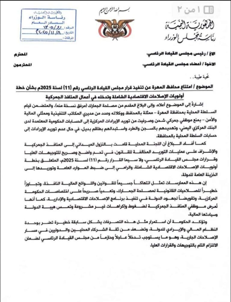 الرئيسية/أخبار البنك المركزي اليمني أخبار البنك المركزي اليمني اقتصادية الانتقالي تشدد على توريد الإيرادات العامة للبنك المركزي وتسريع إعداد موازنة 2026الوزير السقطري يبحث مع وفد البنك الدولي تنفيذ عدد من المشاريع التنمويةالدكتور العليمي يجتمع برئيس الوزراء ومحافظ البنك المركزي لمناقشة توحيد الايراداترئيس مجلس القيادة يجتمع برئيس الوزراء ومحافظ البنك المركزي لمراجعة مسار الإصلاحات الاقتصاديةرئيس الوزراء اليمني يقوم بهذا الإجراء بعد امتناع محافظ المهرة توريد الايرادات الى البنك المركزيأول محافظة ترفض التوريد الى البنك المركزي اليمنياخبار عدن | كف واحد أعاد أموال البنك… وترك ذكرى لا تنسىخدعة حوثية جديدة .. البريد بدل البنك لنهب والتلاعب برواتب المعلمين !!الانتقالي يحمي مكتسبات الجنوب.. قرارات إلزام إيداع الإيرادات في البنك المركزي بعدن ثمرة جهود دؤوبةالمالية توجه بإغلاق الحسابات الحكومية خارج البنك المركزي اليمنياخبار اليمن : وزارة المالية تغلق حسابات الجهات الحكومية وتلزمها بتوريد الإيرادات للبنك المركزيأمانة الانتقالي تؤكد على أهمية الالتزام بقرار "الرئاسي" في توريد جميع الإيرادات إلى البنك المركزيدعوة هامة يوجهها البنك المركزي للمستهلكين في اليمنالمحافظات الغنية هددت وحدة اليمن .. هل بعد التوافق تحكم يدها على الإيرادات و تورديها الى خزينة البنك المركزي ؟الفودعي: البنك المركزي ليس مؤسسة تجارية.. وتعطيله يعني شلل النظام المصرفي بالكاملالقطاع التجاري تحت المجهر.. البنك المركزي يضبط إيقاع التدفقات النقديةوثيقة رئاسية تكشف عن الجهات المتخلفة في التوريد الى البنك المركزياجتماع موسع في لحج يناقش تعزيز الموارد المالية وتوريدها للبنك المركزي”تحذير عاجل من البنك المركزي اليمني”رصد لحجم حركة البواخر في يوم واحد .. كاتب صحفي : مصيبتنا في البنك المركزيالمركزي اليمني يحذر من مزادات غير شرعية لعقارات البنوك في صنعاءعاجل / إعلان تحذيري من البنك المركزي بعدنتحذير عاجل من البنك المركزي اليمني في عدن بشأن تطور خطير يحدث في صنعاءالبنك المركزي يحذر من مغبة المشاركة في اي إجراءات غير الشرعية للتصرف بعقارات مملوكة للبنوكالمجلس الرئاسي بكامل أعضائه يجتمع برئيس الوزراء ومحافظ البنك المركزي.. والاتفاقيات الأخيرة مع السعودية على الطاولةاخبار اليمن | وكيل وزارة التربية يلتقي مدير تربية الضالع لمناقشة منحة البنك الدولي ودعم القطاع التعليمي بالمحافظةاخبار اليمن | شبوة.. استعادة جميع السجناء الفارين من سجن بيحان المركزياتحاد نقابات عمال الجنوب يعلن إيقاف نشاط المجلس التنسيقي لنقابة البنك الأهلي اليمنيوزير التخطيط ومحافظ البنك المركزي يشاركان في الجلسة العامة للاجتماعات السنوية لمجموعة البنك وصندوق النقد الدولييناليمن تشارك في الجلسة العامة للاجتماعات السنوية لمجموعة البنك وصندوق النقد الدولييننائب وزير المالية يبحث مع البنك الدولي مستوى تنفيذ مشروع تحديث المؤسسات والنظم العامة في اليمنمحافظ البنك المركزي يبحث مع صندوق النقد العربي أوجه التعاون ومعالجة مديونية اليمنمحافظ البنك المركزي يستعرض خطوات إصلاحية إيجابية لنظام المصارفمحافظ البنك المركزي ونائب وزير المالية يبحثان مع دائرة الإحصاءات بصندوق النقد تعزيز التعاون والدعم الفنيمليشيات الحوثي تُمعن في نهب الاقتصاد: إيقاف شبكة للتحويلات المالية ضمن سياسة ابتزاز وتصفية حساباتوزارة المالية والبنك المركزي يبحثان مع صندوق النقد العربي مستوى تنفيذ الإصلاحات الشاملةفي اجتماعات واشنطن.. البنك المركزي اليمني يعرض رؤية إصلاحية لاستعادة التوازن الاقتصاديمحافظ البنك المركزي يلتقي رئيس دائرة الشرق الأوسط ووسط آسيا في صندوق النقد الدولي بواشنطناخبار عدن | جلسة تعريفية في المختبر المركزي حول اللوائح الصحية الدولية ضمن برنامج التقييم الذاتي السنويمحافظ البنك المركزي ونائب وزير المالية يشاركان 
