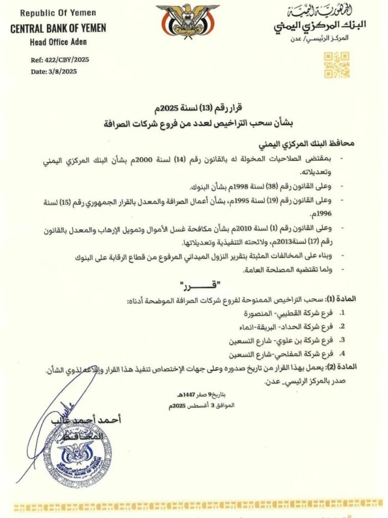 الرئيسية/أسعار الصرف الآن مباشر أسعار الصرف الآن مباشر اخبار عدن | مكتب صحة التواهي يواصل حملاته الميدانية لمراقبة أسعار الأدوية في ظل تحسن سعر الصرفاخبار اليمن | لحج.. تشكيل لجنة نزول إلى الصيدليات ومخازن الأدوية والمختبرات لتخفيض سعر البيع 30%الرئيس الزُبيدي: لا تهاون مع المتلاعبين بسعر الصرف أو المتاجرين في السوق السوداءاخبار عدن | تنفيذ حملة لضبط أسعار الدواجن في مديرية صيرة بعدنلجنة الموارد تؤكد مواصلة الإصلاحات وتحذّر من محاولات التلاعب بأسعار الصرفاخبار اليمن : استقرار في أسعار الصرف في عدن ومأرب وصنعاء.. آخر تحديثاخبار عدن | عدن: حملة رقابية تضبط أسعار الأدوية تزامناً مع تعافي العملةاخبار اليمن : تعرف على أسعار أجهزة وباقات ستارلينك بعد تدشين بيعها رسيمًا في عدن ونقاط البيع بالمحافظات المحررةاخبار اليمن | البنك المركزي بمأرب يتوعد المتلاعبين بالعملة: سنضرب بيد من حديدسعر الدرهم الإماراتي في عدن وحضرموت اليوم الثلاثاء 5 – 8 – 2025أسعار المواشي المحلية اليوم الثلاثاء 5 أغسطس بالعاصمة عدنتقرير يرصد التفاؤل الشعبي لهبوط سعر الصرف وتحسن الاقتصاد وانعكاساته على الوضع المعيشي في عدنمدير عام خورمكسر يوجه بتنفيذ حملات رقابية على أسعار الأدوية تماشياً مع تعميم الهيئة العليا للأدويةأسعار الذهب اليوم الثلاثاء 5-8-2025 في اليمنداعيا القطاع التجاري للتفاعل مع تحسن سعر الصرف.. الزُبيدي يشيد بدور مجموعة هائل سعيد أنعماخبار عدن | عدن.. انطلاق حملة تفتيش صيدلانية لضبط أسعار الأدوية ومحاسبة المخالفينعاجل / البنك المركزي يحدد سقف الحوالات الخارجية وعمليات بيع العملة الأجنبية (وثيقة)اخبار عدن | لملس والوالي يناقشان انعكاس تعافي العملة الوطنية على أسعار المواد الغذائية ومعيشة المواطنفي ما خفّضت أسعار منتجاتها بنسبة 35%.. اشادات واسعة بدور مجموعة هائل سعيد أنعم في دعم استقرار الاقتصاد الوطنياللواء الزُبيدي يشدد على ضرورة التعاطي العاجل من قبل القطاع التجاري مع تحسّن أسعار الصرفاخبار اليمن | مستشفى شبوة العام للأمومة والطفولة يعلن تخفيضات اسعار عدد من الخدمات الطبيةاخبار عدن | من يحمي (الريال اليمني) من أهله!؟.. معركة البنك المركزي التي يجب ان ينتصر فيها"بن بريك" يطلع على إجراءات تخفيض أسعار الأدوية ويوجه بتعزيز الرقابةاخبار عدن | مدير عام خورمكسر يوجه بتنفيذ حملات رقابية على أسعار الأدوية تماشياً مع تعميم الهيئة العليا للأدويةمدير عام مديرية التواهي القاضي وجدي محمد الشعبي يتفقد سير العمل في مشروع الصرف الصحي الجديد بمنطقة الحي السياسي بمنطقه الفتح بالتواهيشركة النفط بالمخا تعلن تسعيرة جديدة للوقود بعد تحسن سعر الصرفاخبار اليمن : توجيهات جديدة وصارمة للبنك المركزي اليمني بعدن لدعم الريال والاستمرار في صعودهالبنك المركزي بشبوة ينفذ حملة ميدانية ويغلق محلات صرافة مخالفةقرار جديد من البنك المركزي يقضي بإيقاف تراخيص 4 شركات صرافة وإغلاق مقراتهامحافظ البنك المركزي يصدر قرار بسحب تراخيص واغلاق مقرات 4 شركات ومنشآت للصرافةالرئيس الزُبيدي يشدد على ضرورة التعاطي العاجل من قبل القطاع التجاري مع تحسّن أسعار الصرفاخبار اليمن : توجيهات جديدة لرئاسة الوزراء بخصوص تخفيض أسعار الأدوية وفرق التفتيش تباشر النزول الميدانيمجموعة هائل سعيد أنعم التجارية تعلن تحديث أسعار منتجاتهافي لقائه برشاد هائل .. الرئيس الزُبيدي يدعو إلى تحمّل المسؤولية وخفض أسعار السلع مع تحسّن أسعار الصرفليست الحكومة.. صحفي يمني يكشف عن وثيقة سرية توضح من وراء تحسُّن سعر الصرفالرئيس الزُبيدي يطالب التجار بالتجاوب مع تحسن أسعار الصرفالمهرة.. المحافظة الوحيدة التي لم تشهد انخفاضًا في الأسعار رغم تحسن سعر الصرفتعميم صادر عن شركة النفط في المهرة بشأن تعديل أسعار الوقوداخبار عدن | مجموعة هائل سعيد أنعم تعلن عن تخفيضات كبيرة في أسعار منتجاتها الغذائية لشهر أغسطس 2025مأرب تبدأ حملة تصحيحة لإعادة النظر في أ