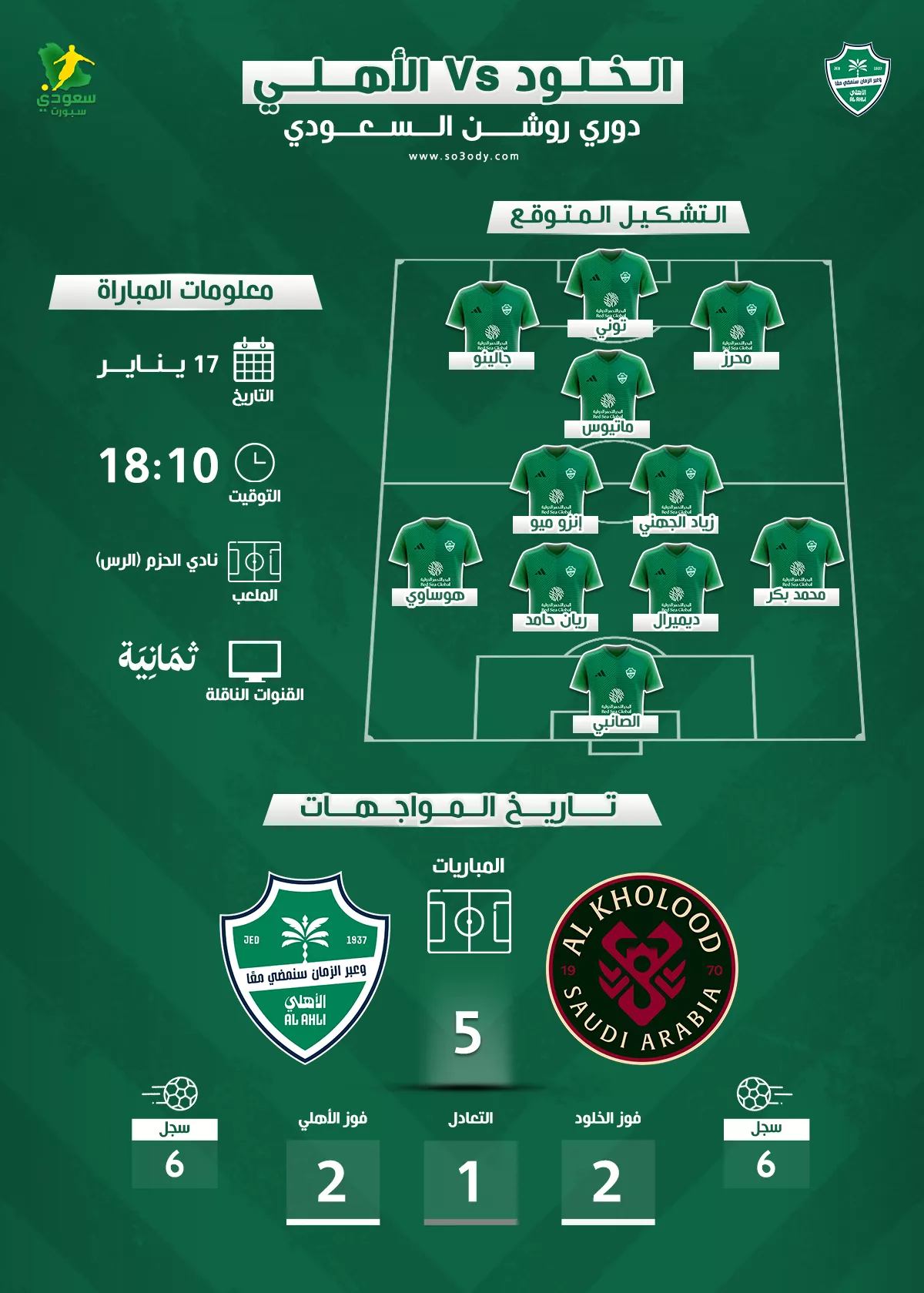 وتقام المباراة التي تجمع بين الأهلي والخلود، ضمن لقاءات الجولة 16 من منافسات دوري روشن، حيث يحتل “الراقي” المركز الرابع في جدول ترتيب الدوري السعودي برصيد 31 نقطة، ويسعى إلى مواصلة انتصاراته.
