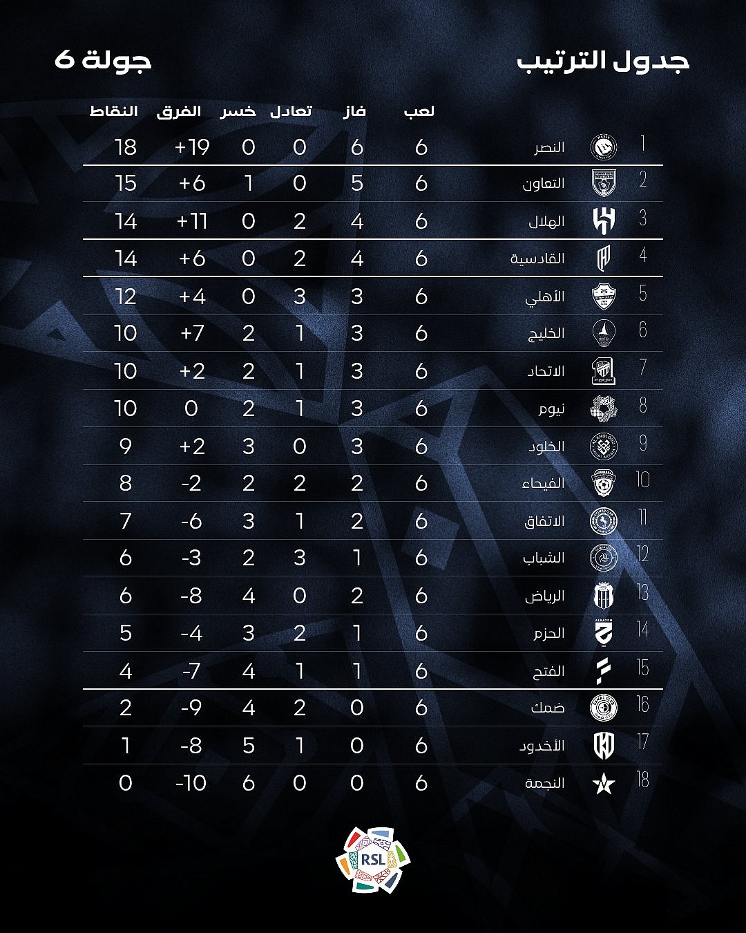 يتصدر النصر جدول الترتيب برصيد 18 نقطة، يليه التعاون بـ15 نقطة، ثم الهلال بـ14 نقطة.