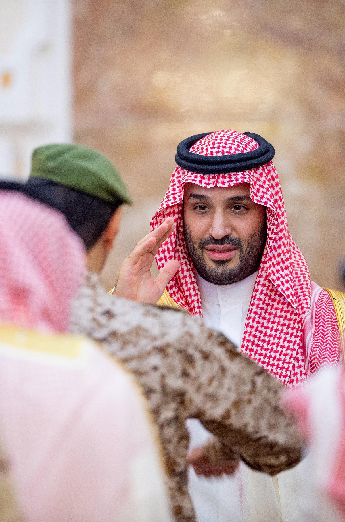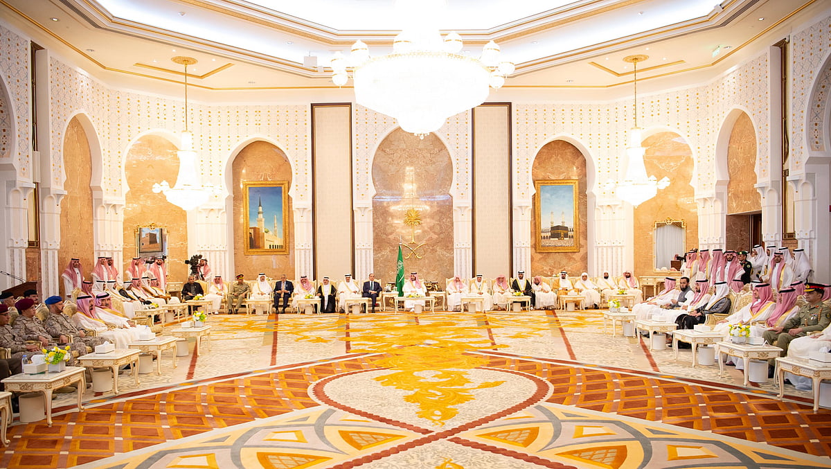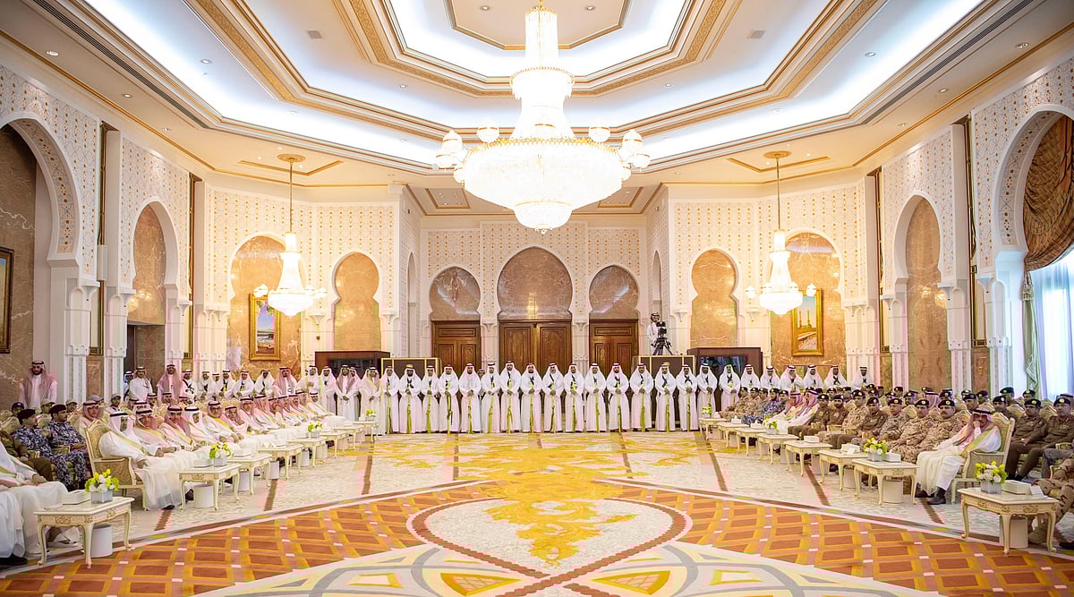 نيابة عن خادم الحرمين الشريفين الملك سلمان بن عبدالعزيز آل سعود القائد الأعلى لكافة القوات العسكرية ـ حفظه الله ـ، استقبل صاحب السمو الملكي الأمير محمد بن سلمان بن عبدالعزيز آل سعود ولي العهد رئيس مجلس الوزراء، في الديوان الملكي بقصر منى، اليوم، المهنئين بعيد الأضحى المبارك، وهم دولة السيد محمد شهباز شريف رئيس الوزراء في جمهورية باكستان الإسلامية، وأصحاب السمو الملكي الأمراء، وسماحة مفتي عام المملكة، وأصحاب الفضيلة العلماء والمشايخ، وكبار المدعوين من دول مجلس التعاون لدول الخليج العربية، وأصحاب المعالي الوزراء، وقادة القطاعات العسكرية المشاركة في حج هذا العام، وقادة الأسرة الكشفية في المملكة المشاركة في الحج.