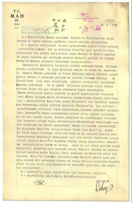 وجاء كشفت المخابرات التركية عن الوثائق بمناسبة الذكرى الـ99 لتأسيس جهاز “الاستخبارات الوطني التركي” ومن بينها الوثيقة المؤرخة في 23 سبتمبر 1929، وتؤكد نشاطات الجاسوس “لورانس العرب” في دول المنطقة وخاصة في فلسطين.