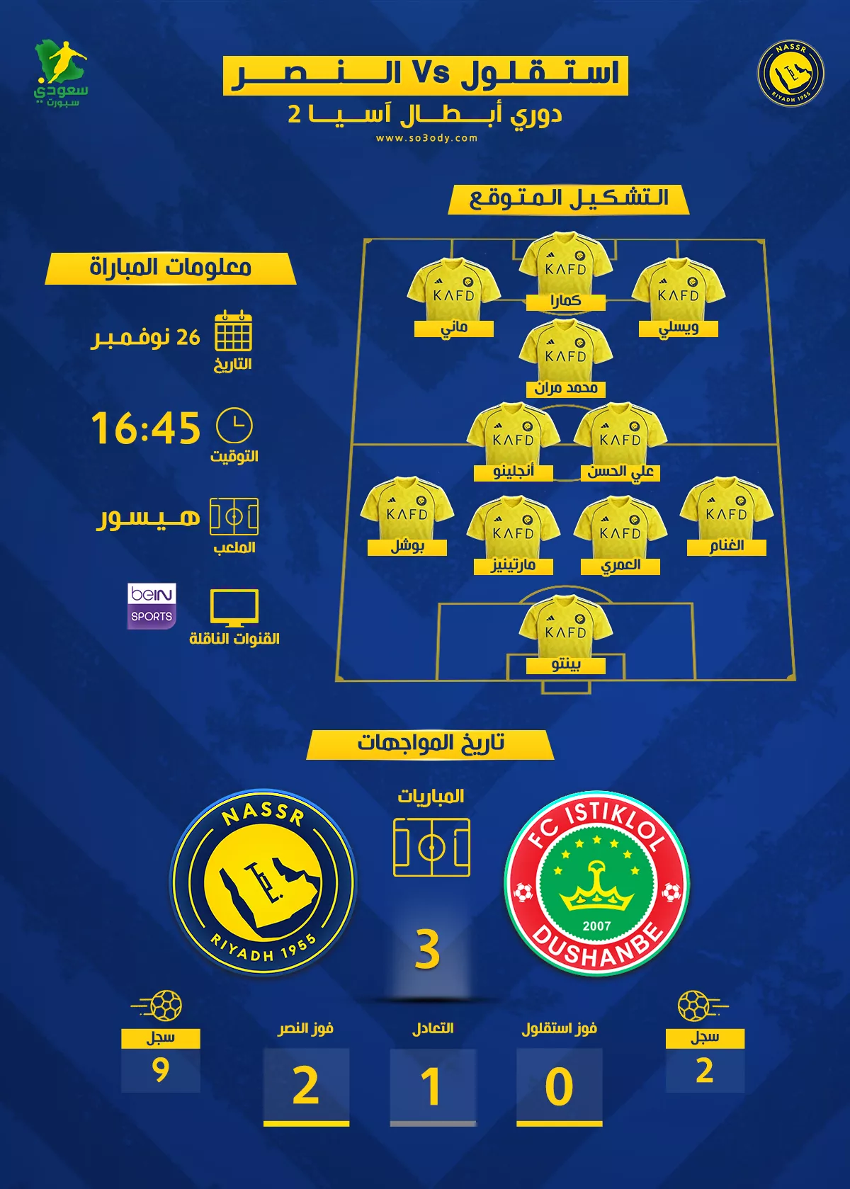 يلعب النصر ضد استقلول الطاجيكي، في الرابعة و45 دقيقة عصر الأربعاء، الموافق 26 نوفمبر 2025.