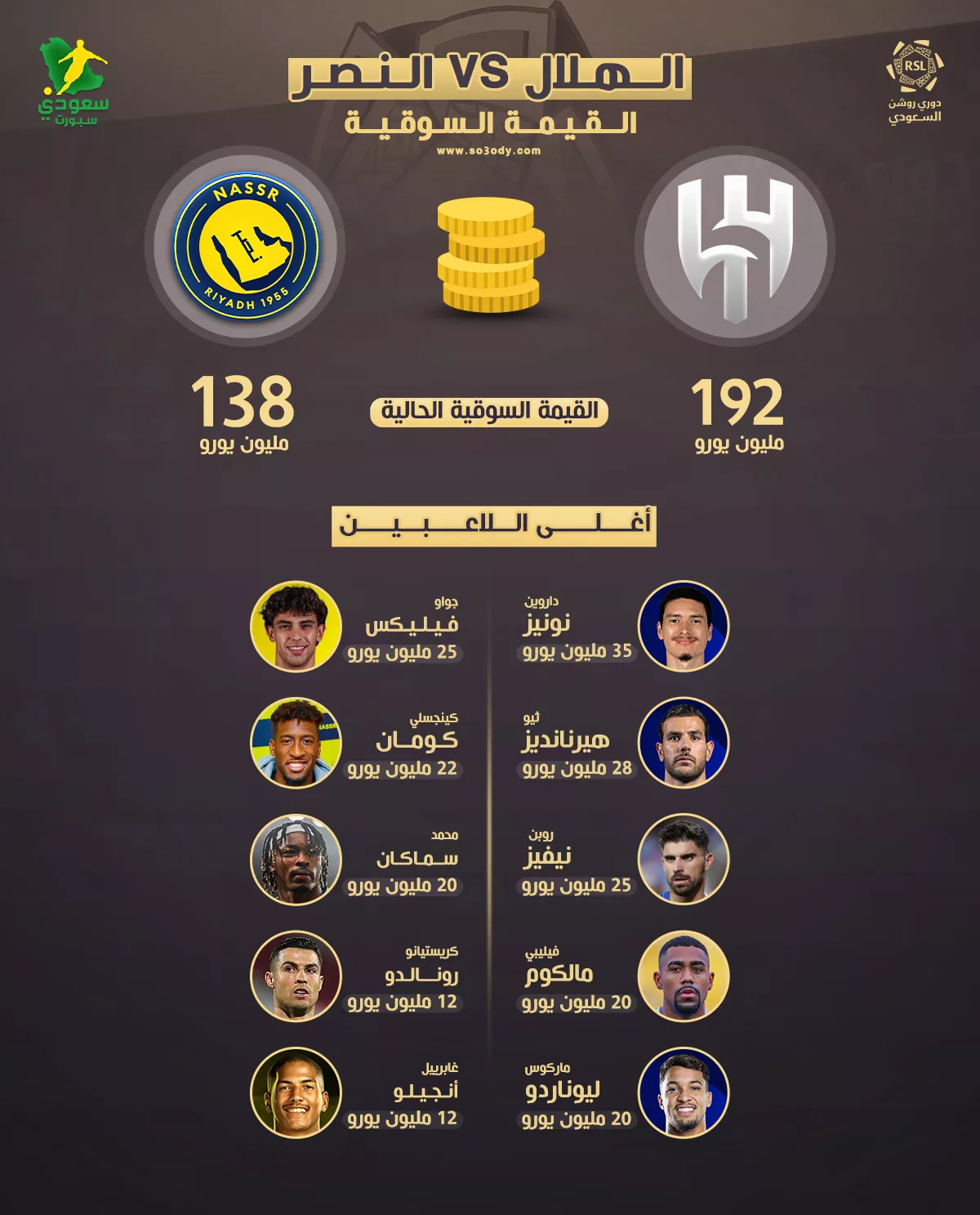 ويتغلب الهلال على النصر، قبل مباراة الغد في القيمة السوقية للفريق، وأيضًا على مستوى اللاعبين في القيمة.
