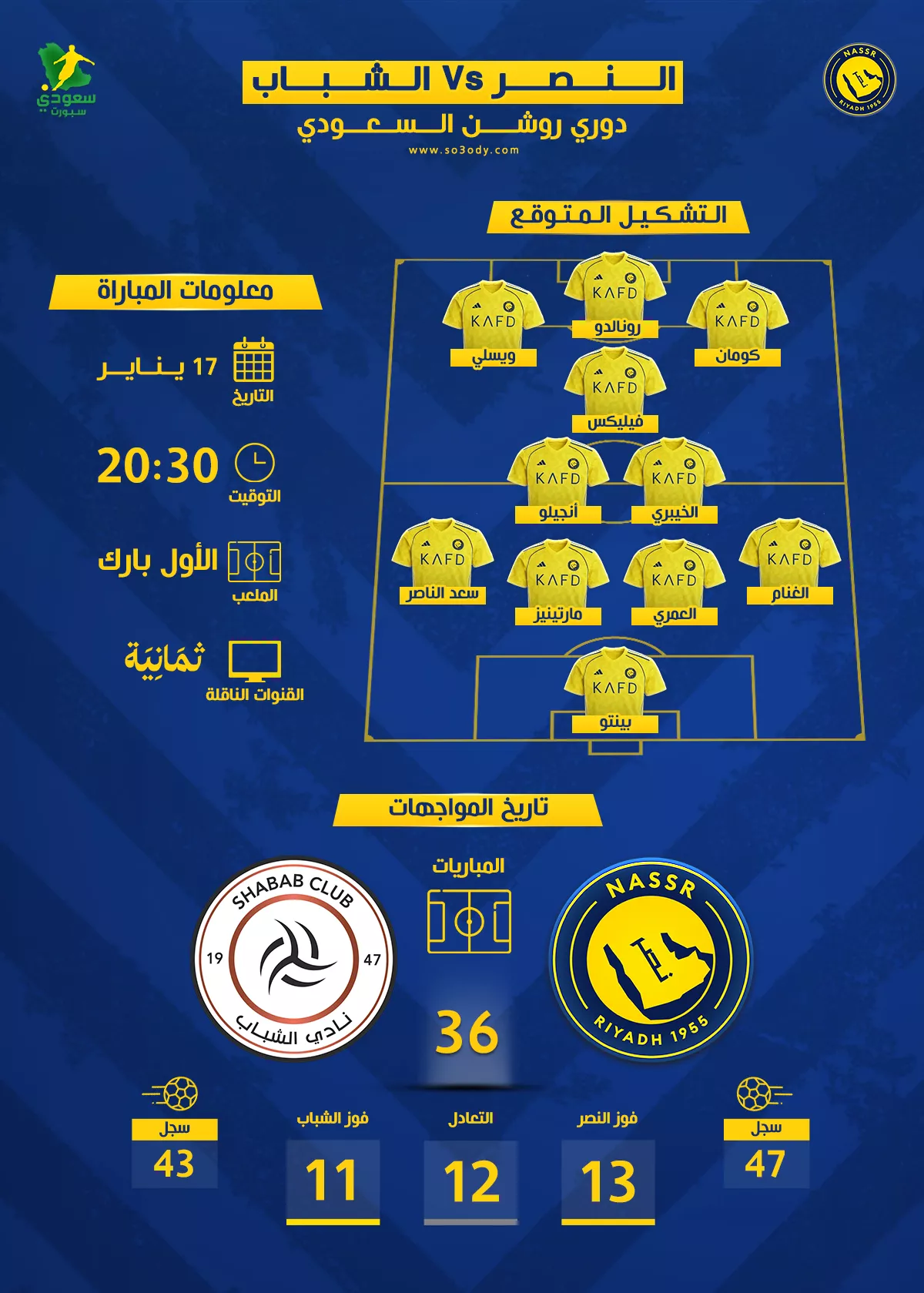 موعد مباراة النصر والشباب في دروي روشن