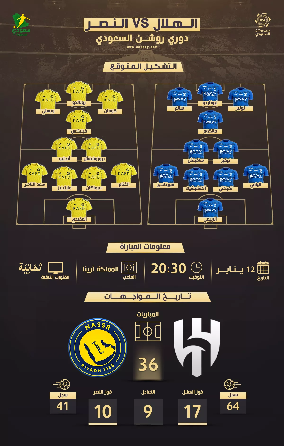 | الهلال × النصر | 08:30 مساءً | 12 يناير 2026 | المملكة آرينا | ثمانية |