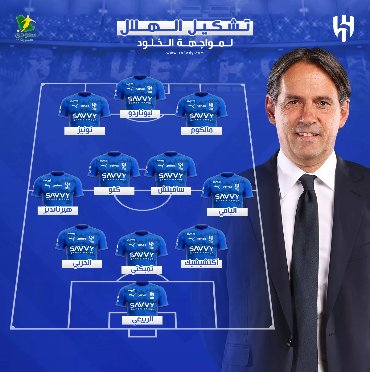 أعلن الإيطالي سيموني إنزاجي المدير الفني للفريق الأول لكرة القدم بنادي الهلال، تشكيل مباراة الخلود، في مسابقة دوري روشن للمحترفين.