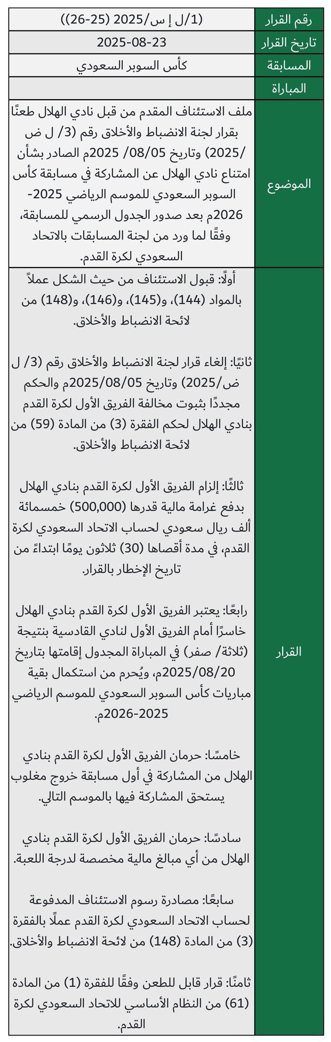 أصدرت لجنة الاستئناف السعودية قراراتها بشأن انسحاب الهلال من المشاركة في كأس السوبر السعودي.
