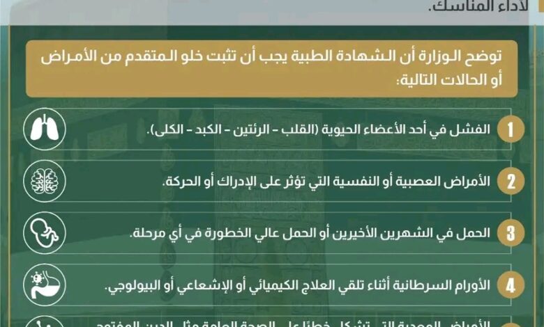 وبيّن البيان أن الأمراض والحالات التي تمنع منح الشهادة الطبية تشمل: فشل الأعضاء الحيوية مثل القلب أو الرئتين أو الكبد أو الكلى، الأمراض العصبية أو النفسية المؤثرة على الإدراك أو الحركة، الحمل في الشهرين الأخيرين أو الحمل عالي الخطورة، الأورام السرطانية النشطة أثناء تلقي العلاج الكيميائي أو الإشعاعي، الأمراض المعدية التي تهدد الصحة العامة مثل الدرن المفتوح ( السل الرئوي ).