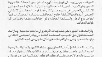 وأكدت المملكة أن هذه الجهود لا تزال مستمرة لإعادة الأوضاع إلى ما كانت عليه، مع التعويل على استجابة عاجلة من المجلس الانتقالي لإنهاء التصعيد وسحب قواته بسلاسة، بما يحقق المصلحة العامة ويحفظ الأمن والاستقرار.