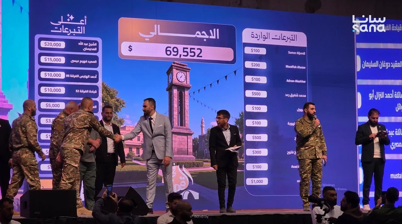 فمع كل تبرع، سواء كان صغيراً أو كبيراً، كانت الأجواء تمتلئ بالتكبيرات والبهجة، وتبدو الابتسامات واضحة على وجوه الحاضرين. كان بعضهم يقفز من الفرحة، ويعبر عن امتنانه لكل من ساهم، سواء كانوا أطفالاً، نساءً، مجاهدين، مغتربين، أشخاصاً أثرياء أو مواطنين عاديين. وفي كل مكان، ترفرف أعلام سورية الحرة، وتلمع العيون بحماسة ولهفة، لترسم مشهداً حياً يفيض بالفرح والانتماء.