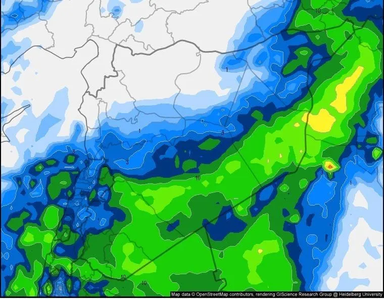وأشارت خريطة الطقس المرفقة إلى أن المناطق ذات الهطولات المتوسطة تظهر باللون الأخضر، بينما الغزيرة تظهر باللون الأصفر.