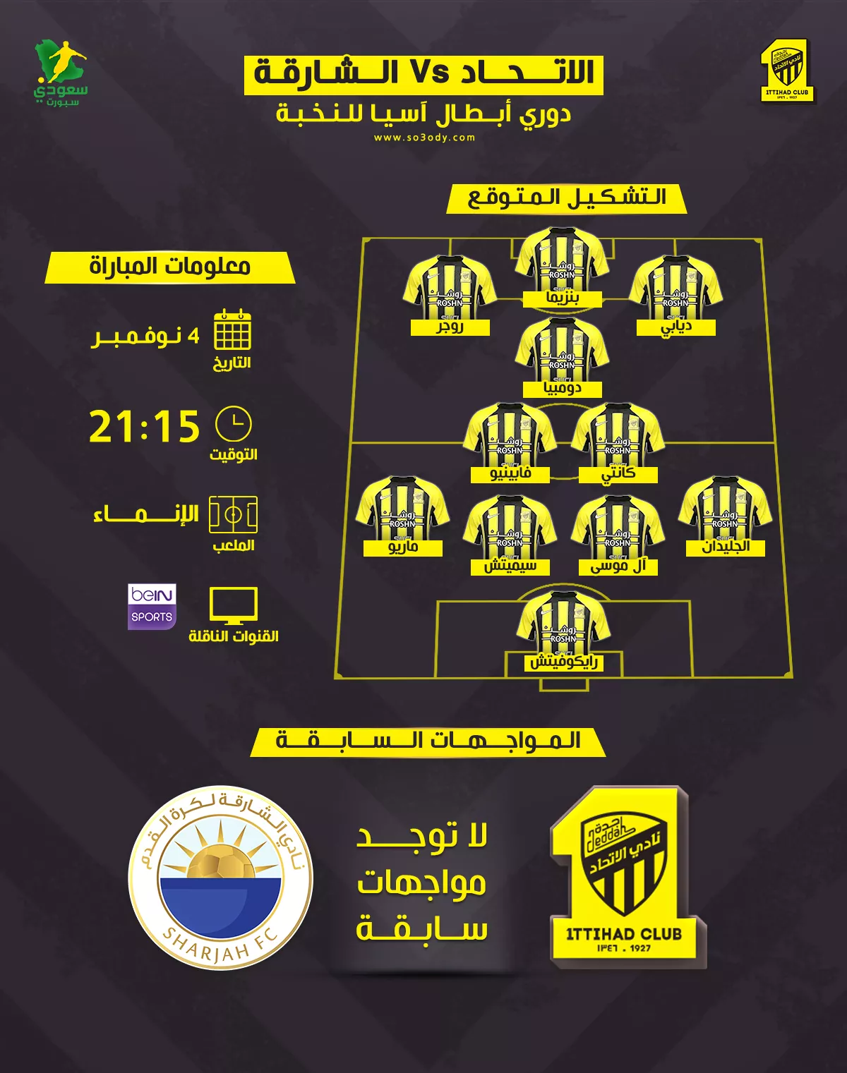 يستضيف الاتحاد نظيره الشارقة الإماراتي في الجولة الرابعة من دوري المجموعات من نخبة آسيا مساء الثلاثاء، على ملعب مدينة الملك عبدالله الرياضية في جدة “الإنماء.