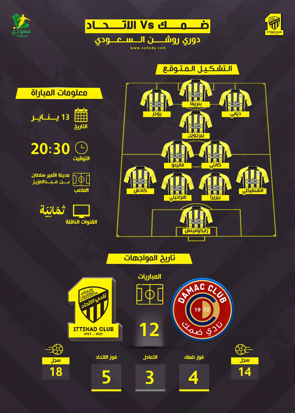 يحتضن ملعب مدينة الأمير سلطان بن عبدالعزيز الرياضية، مساء يوم غد الثلاثاء 13 يناير، مواجهةً كرويةً مرتقبةً تجمع بين فريقي ضمك والاتحاد، وذلك ضمن منافسات الجولة الخامسة عشر من منافسات دوري روشن، حيث يدخل الفريقان اللقاء بطموحات متباينة، وسط تطلع جماهيري لمشاهدة مباراة فنية عالية.