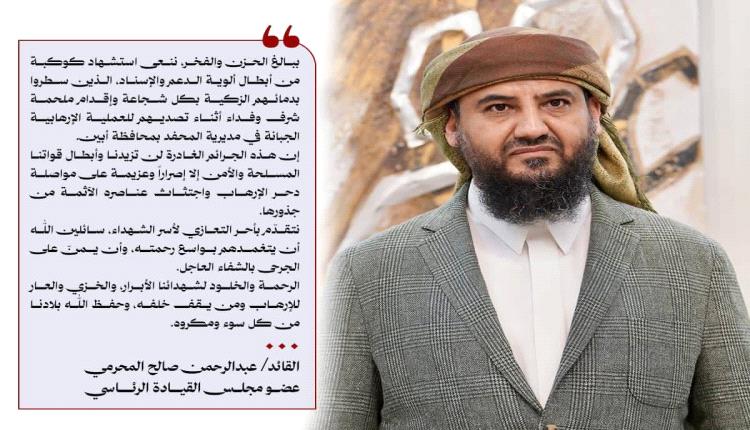 وأكد القائد المحرمي، في منشور له على صفحته الرسمية على مواقع التواصل الاجتماعي، أن الأبطال الشهداء “سطروا بدمائهم الزكية بكل شجاعة وإقدام ملحمة شرف وفداء أثناء تصديهم للعملية الإرهابية الجبانة”.