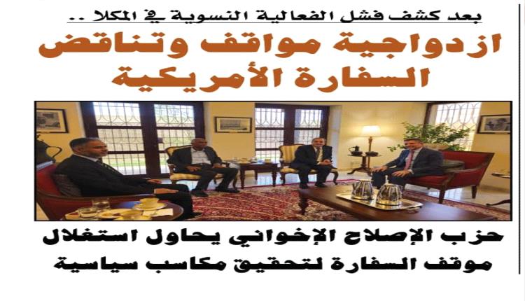 شهدت مدينة المكلا بمحافظة حضرموت، مؤخرًا، فشلًا لافتًا لفعالية نسوية كان حزب الإصلاح الإخواني يعتزم تنظيمها بمناسبة العيد الوطني الـ63 لثورة 26 سبتمبر والذكرى الـ62 لثورة 14 أكتوبر. وقد اعتبر العديد من أبناء حضرموت الفعالية استفزازية لمشاعرهم، ما أدى إلى فشلها بشكل كامل. هذا الحدث كشف عن سلسلة من المواقف المتناقضة، سواء من الحزب نفسه أو من السفارة الأمريكية في اليمن.