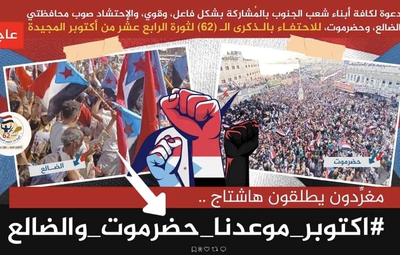 وعصر اليوم الأربعاء 8 أكتوبر / تشرين الأول 2025م، اطلق ناشطون وسياسيون جنوبيون، هاشتاج #اكتوبر_موعدنا_حضرموت_والضالع على مواقع التواصل الاجتماعي، اشهرها منصة X))، (تويتر) سابقًا، وذلك لدعوة كافة أبناء شعب الجنوب إلى المُشاركة بشكل فاعل، وقوي، والإحتشاد صوب محافظتيّ (الضالع، وحضرموت)، للاحتفاء بالذكرى الـ (62) لثورة الرابع عشر من أكتوبر المجيدة، وذلك بناءً على الدعوة التي وجهها الرئيس القائد عيدروس بن قاسم الزُبيدي، إلى كافة أبناء شعب الجنوب.