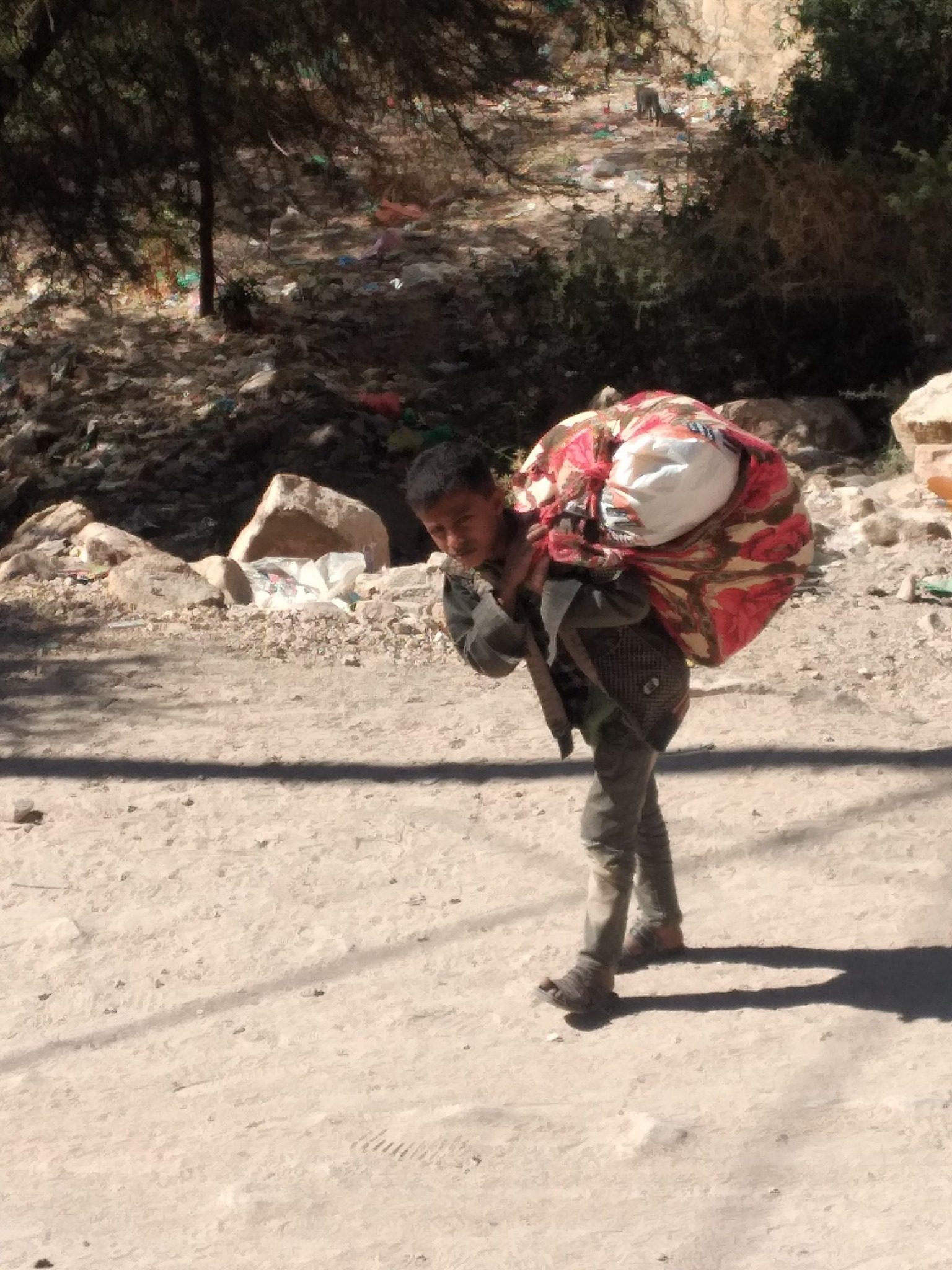 تداول ناشطون يمنيون صورة لطفل يمني على مواقع التواصل الاجتماعي وهو يحمل كيساً كبيراً على ظهرة ويبيع بعض الأدوات .