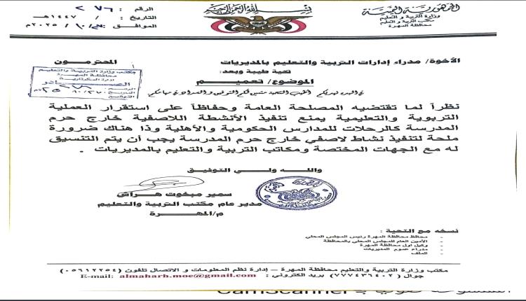 أثار قرار صادر عن مكتب التربية والتعليم بمحافظة المهرة يقضي بإيقاف الرحلات والأنشطة والفعاليات اللاصفية في المدارس، تحت مبرر “الحفاظ على استقرار العملية التربوية”، موجة استياء واسعة في الأوساط التعليمية والمجتمعية.