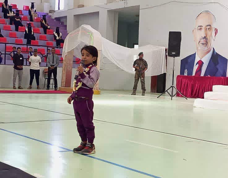 القى طفل في محافظة الضالع جنوب اليمن كلمة في احتفالية تخرج طلاب كلية الضالع الجامعية بحضور قيادات رفيعة من بينها عضو هيئة رئاسة المجلس الانتقالي عبدالعزيز بن عبدالرحمن الجفري وعبدالعزيز ال الشيخ .