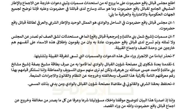 أصدر مجلس قبائل يافع حضرموت بيانًا هامًا اليوم، أكد فيه رفضه التام لظهور مسميات قبلية اعتبرها محاولات لشق الصف وتشتيت قبائل يافع في حضرموت، مؤكّدًا على وحدة الموقف تحت الإطار المشيخي الجامع.