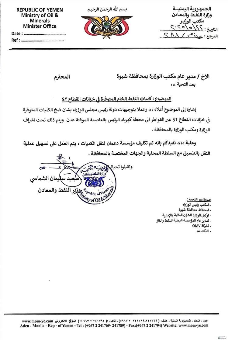 ووفقًا لمذكرتَين رسميتَين، سيتم نقل نحو 116 ألف برميل من النفط المخزّن في قطاع (S2) إلى قطاع (4) عبر 4,000 برميل يوميًا، باستخدام القاطرات وتحت إشراف مؤسسة “دعمان” للمقاولات، بالتنسيق مع السلطات المحلية في شبوة.