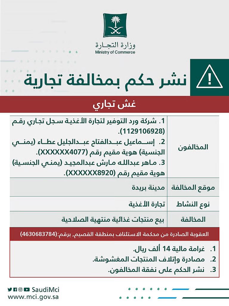 شهرت وزارة التجارة السعودية بمنشأة تجارية وعاملين اثنين لديها من الجنسية اليمنية، بعد صدور حكم قضائي يدينهم بمخالفة نظام مكافحة الغش التجاري لحيازتهم وعرضهم وبيعهم منتجات غذائية منتهية الصلاحية.