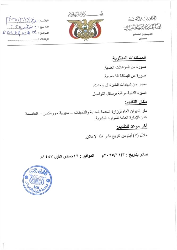 أعلنت وزارة الخدمة المدنية والتأمينات عن توفر وظيفتين فنيتين في ديوانها العام بالعاصمة عدن.