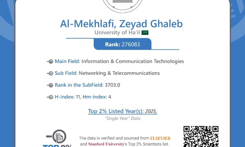 الدكتور زياد غالب المخلافي ضمن قائمة أفضل 2% من علماء العالم لعام 2025
