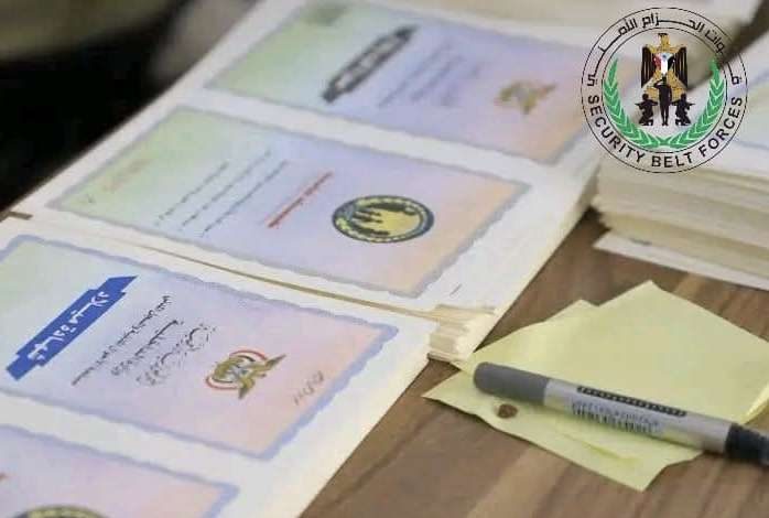 قوات الحزام الامني تضبط أوراقًا ثبوتية غير قانونية قادمة من مناطق سيطرة مليشيات الحوثي
