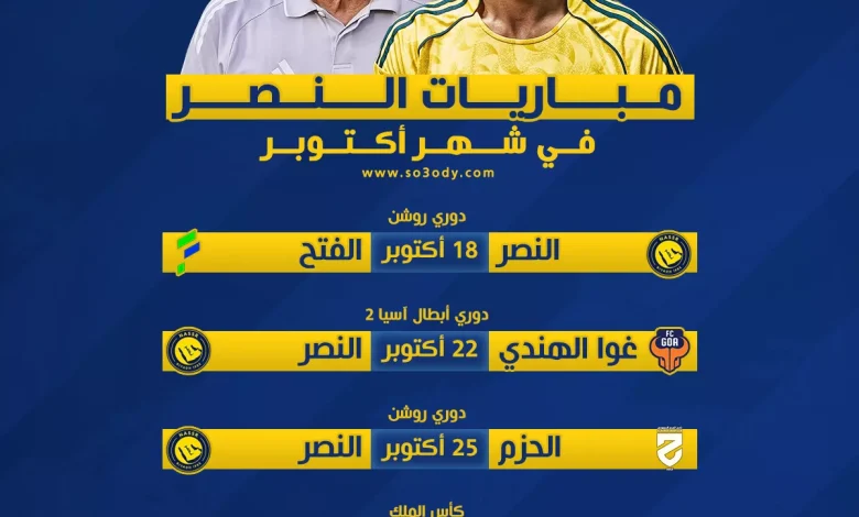 اخبار النصر السعودي : مباريات النصر في أكتوبر | كلاسيكو “ثالث” ضد الاتحاد .. منافسات قوية في روشن ورحلة إلى الهند