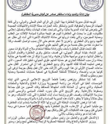 قبائل المقاطرة في لحج تعلن النفير العام ضد ما اسموه انتهاكات قوات محور طور الباحة
