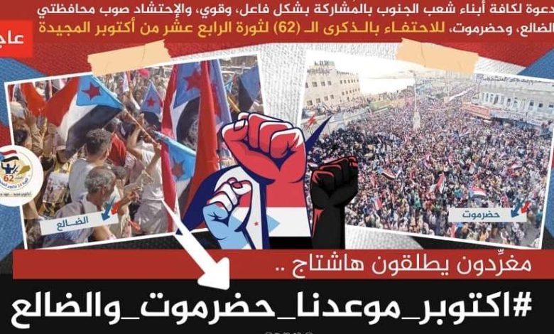 سياسيون ونشطاء جنوبيون يدعون أبناء شعب الجنوب إلى الإحتشاد بالضالع وحضرموت في ذكرى 14 أكتوبر المجيدة ويطلقون وسم #اكتوبر_موعدنا_حضرموت_والضالع