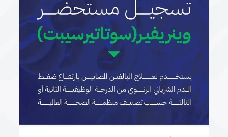 اخبار السعودية : "الدواء اليتيم" .. "الغذاء والدواء": تسجيل مستحضر "سوتاتيرسيبت" لعلاج ارتفاع ضغط الدم الشرياني الرئوي