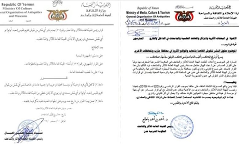 تعميمًا رسمياً يقضي ببطلان القرار الصادر عن ميليشيا الحوثي حول نشر النقوش التاريخية