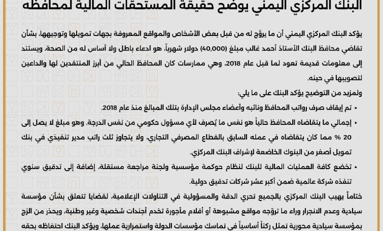 اخبار اليمن : البنك المركزي ينفي مزاعم صرف مستحقات مالية للمحافظ ويكشف الحقائق