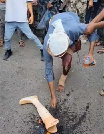 بمشهدٍ يدمي القلوب.. جريح حرب في تعز يحرق طرفه الصناعي احتجاجاً على تجاهل مستحقاته