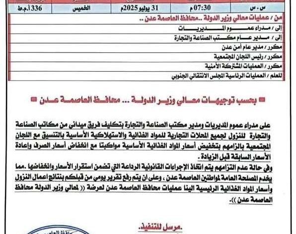 محافظ العاصمة عدن يوجّه بحملة رقابية لضبط أسعار المواد الغذائية الأساسية