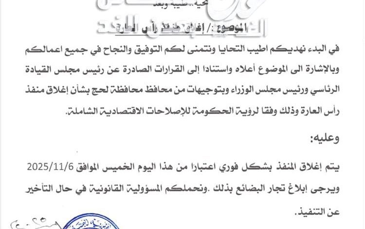 توجيهات بإغلاق منفذ رأس العارة في محافظة لحج بشكل فوري