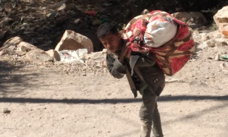 شاهد كيف ظهر طفل يمني بدكان متجول على ظهره .. صورة
