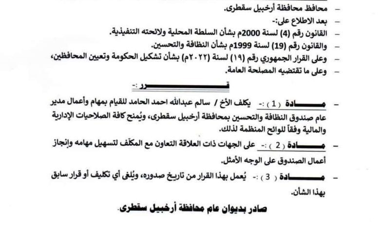 محافظ سقطرى يُصدر قرارًا بتكليف سالم الحامد مديرًا عامًا لصندوق النظافة والتحسين بالمحافظة
