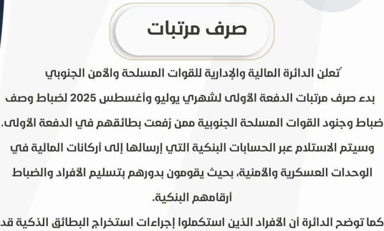 الدائرة المالية والإدارية لقواتنا المسلحة والأمن الجنوبي تعلن بدء صرف مرتبات الدفعة الأولى لشهري يوليو وأغسطس