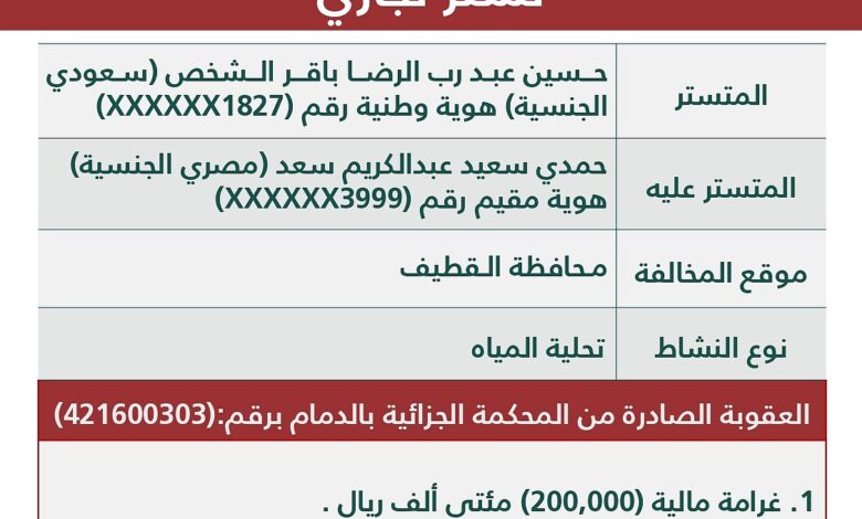 اخبار السعودية : "التجارة" تٌشهر بـ "حسين عبد رب الرضا باقر الشخص" و"حمدي سعيد عبدالكريم سعد" لارتكابهما جريمة التستر في نشاط تحلية المياه