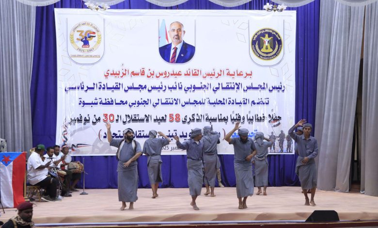 انتقالي شبوة ينظم حفلاً خطابياً وفنياً احتفاءً بالذكرى الـ58 لعيد الاستقلال الـ30 من نوفمبر