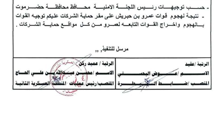 قيادة حضرموت تصدر أمراً عسكرياً لإنهاء تمرد بن حبريش بعد اعتدائه على مواقع النفط